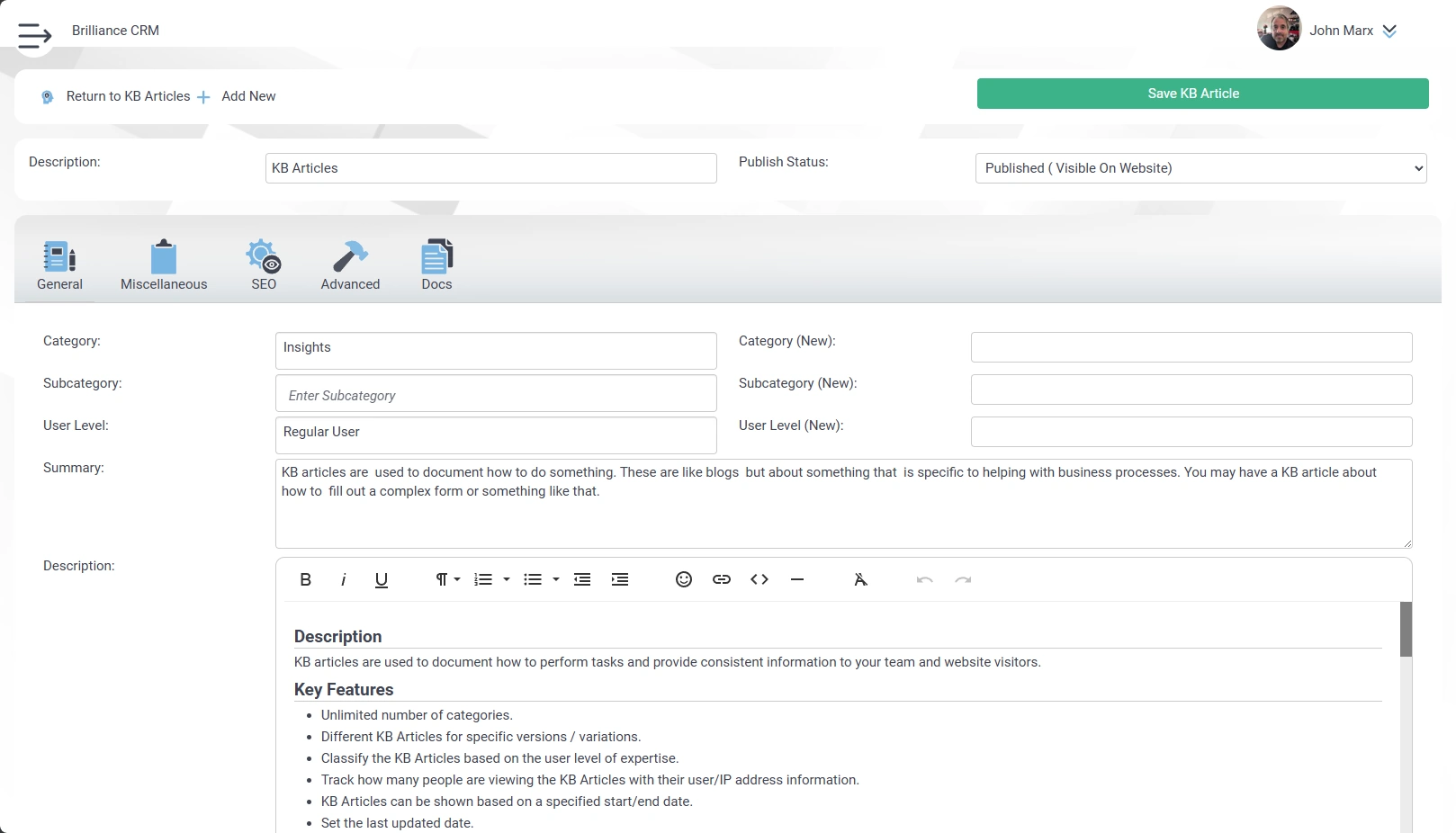 - User Level: The level of knowledge a user should have to be able to use this article. For example, an Administrator (Advanced) should be used by those that are familiar with the overall site.