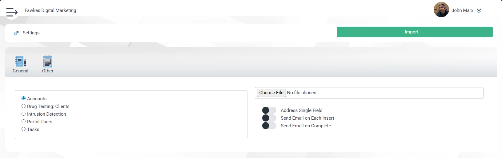 - Optional Settings - if you are importing into a module that has the option of sending emails when inserting a new record (e.g., Tasks or Testimonials), you can choose