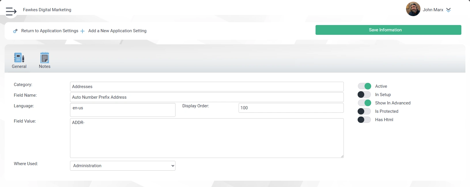 - Active: If you don't want an application setting to be used then you can uncheck this box. If an item is not active it will not be able to be used by the system and is only displayed within Appliation Settings.