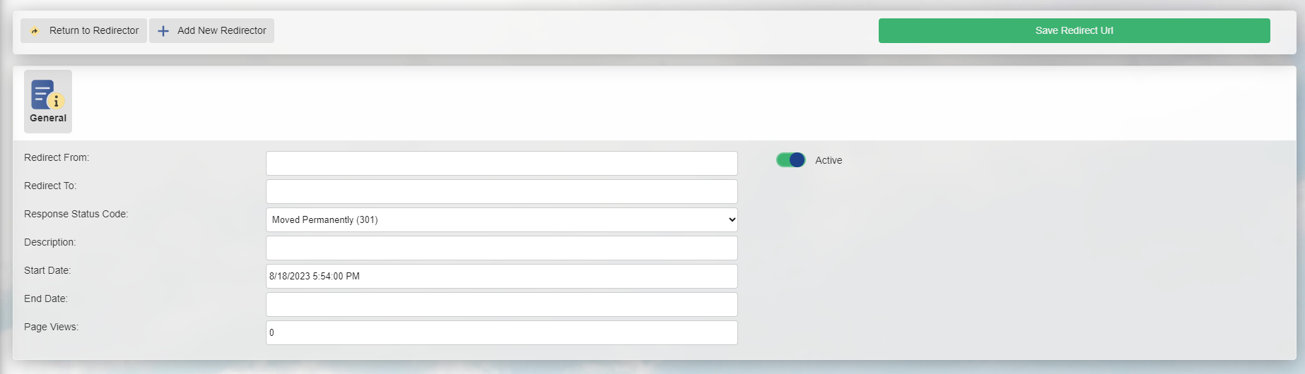 - Page Views: Although you cannot set this will show you the number of times the Redirect From url was accessed and the requested Response Status Code has happened.