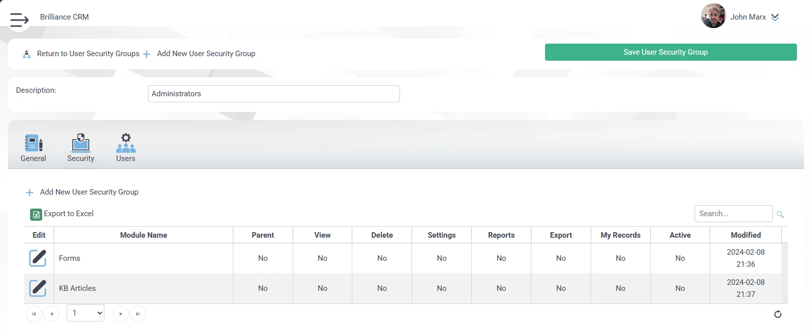 - Grid: Shows all the modules that are currently integrated into the Portal User Security Group.