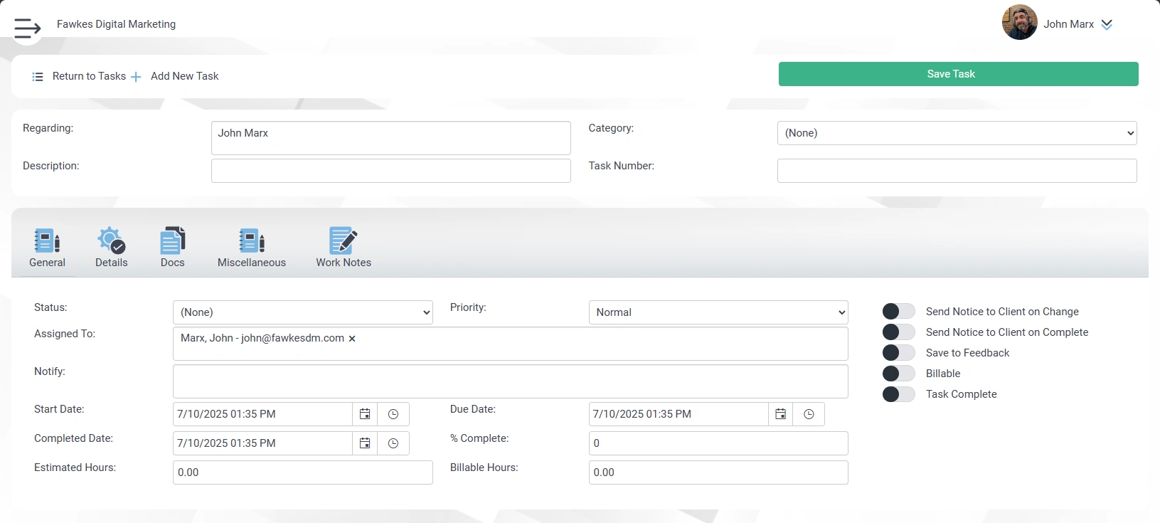 - Send Notice to Client on Change: Should a notice be sent to the customer whenever the Save Task button is clicked.