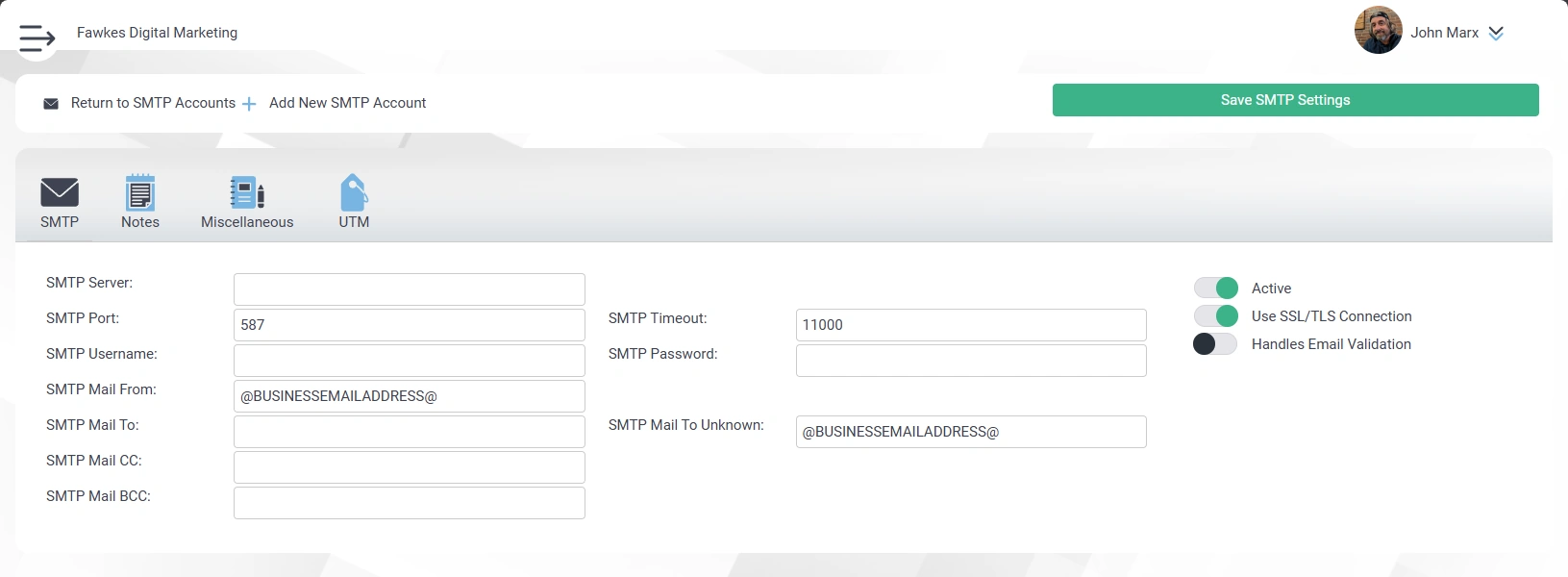 - Notes: text field for documenting any additional information or comments about this SMTP configuration. Use it for tracking setup details or changes.